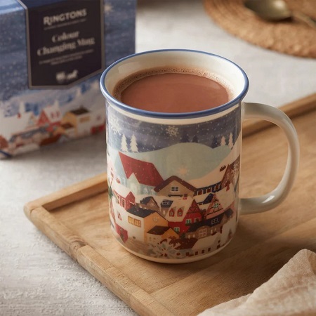 英国では、このお湯を注ぐと、色が変わるというユニークな「カラーチェンジングマグ」は様々なデザインでよく売られている人気アイテムです。リントンズのカラーチェンジマグはこのデザインだけでポップでおしゃれなマグだと思います。よく見るサンタさんやツリーなどのクリスマスマグではなく、 “冬の街並み”という珍しい視点が好きです。それぞれの英国のお家もかわいくてニコニコしてしまいます。日本ではなかなか出逢えない“デザイン”です。そして、一番の「英国人好みのマグカップ」なのは ティーポットを使わず、マグで紅茶を作るという今のリアルな英国ティータイムを象徴するマグのサイズ感。リントンズのゴールドやブレックファストなど1包で400cc抽出できるティーポット用ティーバッグをこのマグに1包入れて作れちゃう英国サイズのBIGマグです。日本ではなかなか出逢えない“サイズ感”です。ぜひお家やオフィスで使って、カラーチェンジングもサイズ感もティータイムしながら、じわじわ“英国”を楽しんでください