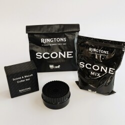 こちらのセットにはリントンズオリジナルのグッズも!スコーン製造には欠かせない「型」もセットにしました。色もブラックで特注品です。8サイズもあるので、スコーンだけでなくビスケットも作れます。しかも、両面使える優れもの。シンプルなラウンド型、裏にすれば花形。一口サイズの小さなミニスコーンから英国カントリーサイドのような大きなスコーンまで自分好みの大きさのスコーンが作れます。そして、ただのスコーンミックス袋では面白くない、と製作したのがキッチンに置いておくだけでもテンションが上がるスコーンミックス袋です。リントンズのスコーンミックスとスコーンカッターはおしゃれな「SCONE」と書かれたバッグに入っています。クルクルとまるめて、マジックテープで止める感じもかわいい。裏面には、イギリスのリントンズ社によるスコーン作りのコツが書かれています。最後に書かれた言葉もイギリスらしくて好きなんです。細部までこだわって製作した「SCONE」バッグです。イギリスでも定番の丈夫なエコバッグ素材で作られているので、長く楽しめるのも魅力です。さら「レシピカード(日本語&写真付き)」もお付けします。こだわりの詰まったセットでティータイムを楽しんでください。